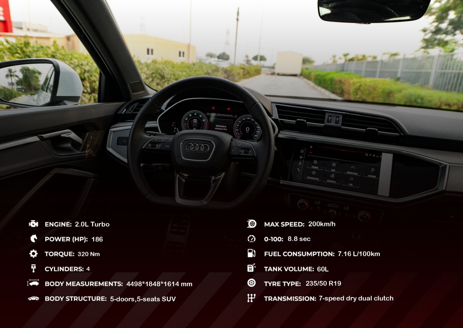 Rent and drive this Audi Q3 2025 in Dubai, UAE for AED 599/day & AED 13500/monthly. Rental cost includes basic comprehensive insurance and standard mileage limit of 250 km/day (AED 5 – AED 30 per additional km applicable). Contact Premium Crystal Car Rental directly for bookings and inquiries.
