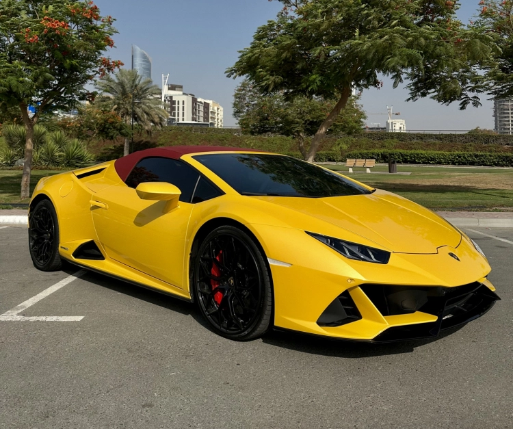 Rent and drive this Lamborghini Huracan Evo Spyder 2022-model in Dubai, UAE for AED 3500/day & AED 71999/month. Rental cost includes basic comprehensive insurance and standard mileage limit of 250 km/day (AED 5 – AED 30 per additional km applicable). Contact Premium Crystal Car Rental directly for bookings and inquiries.